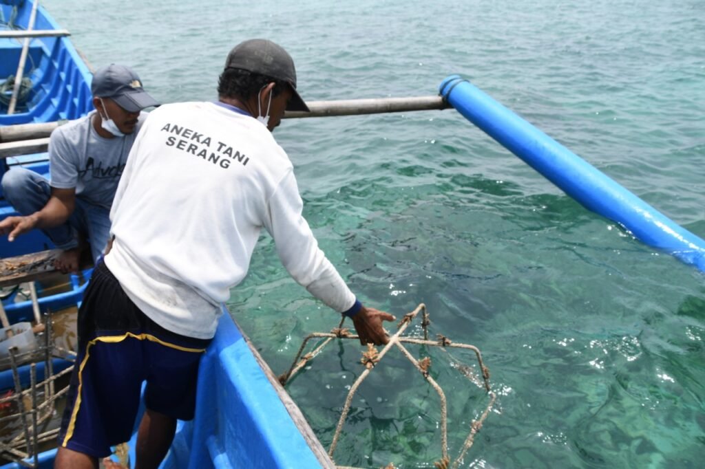 PANDEGLANG.- Untuk pertama kalinya, nelayan di Kampung Katapang, Desa Tunggaljaya, Kecamatan Sumur, Kabupaten Pandeglang, Provinsi Bantehn melakukan kegiatan transplantasi terumbu karang di kawasan Pulau Badul, Sabtu (21/05/2022). Dengan dibimbing oleh petugas Taman Nasional Ujung Kulon (TNUK), Heri Juanda, sebanyak enam nelayan, Ruyadinata, Ari, Nurjaya, Jana, Madluwi, Saptur siang itu "menanamkan" sebanyak 50 rak jaring laba-laba (webspider) yang berisi sekira 900 bibit/fragmen karang di sekitar Pulau Badul.