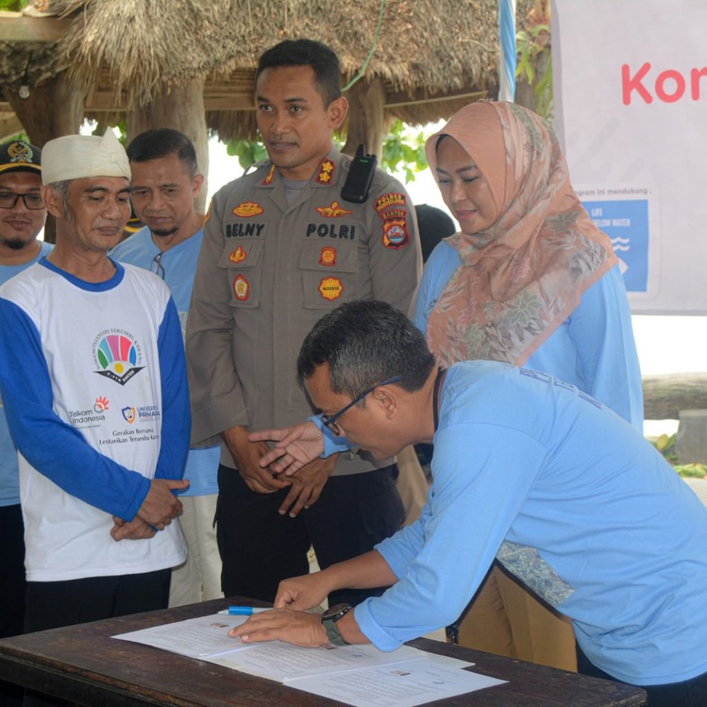PANDEGLANG.- PT. Telkom Indonesia bersama Forum Pelestari Terumbu Karang (F-PTK) Banten, Rabu (07/06/2023) menandatangani Pakta Integritas guna mendukung pelaksanaan Program Konservasi Terumbu Karang Tahap III di Pulau Liwungan, Kecamatan Panimbang, Kabupaten Pandeglang.